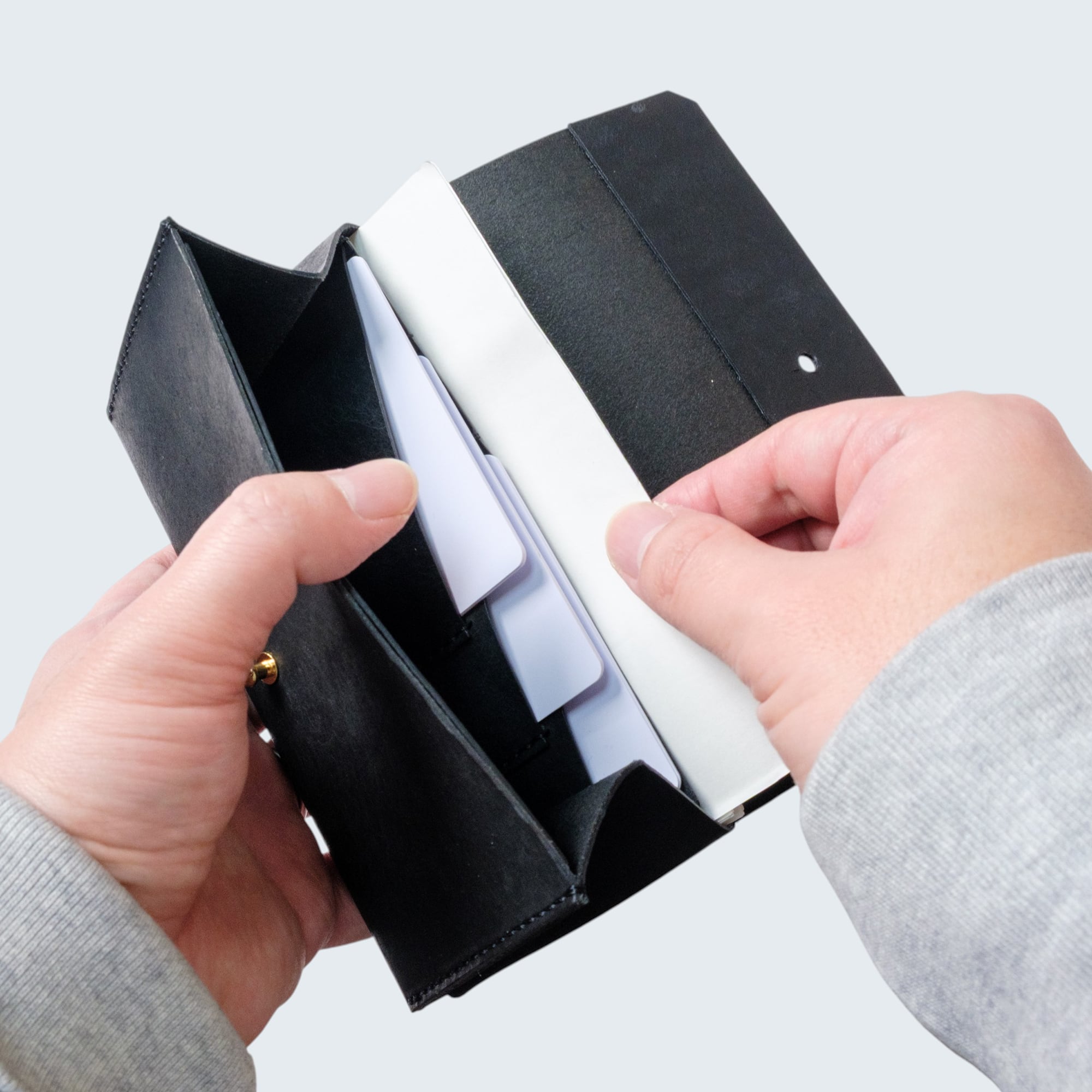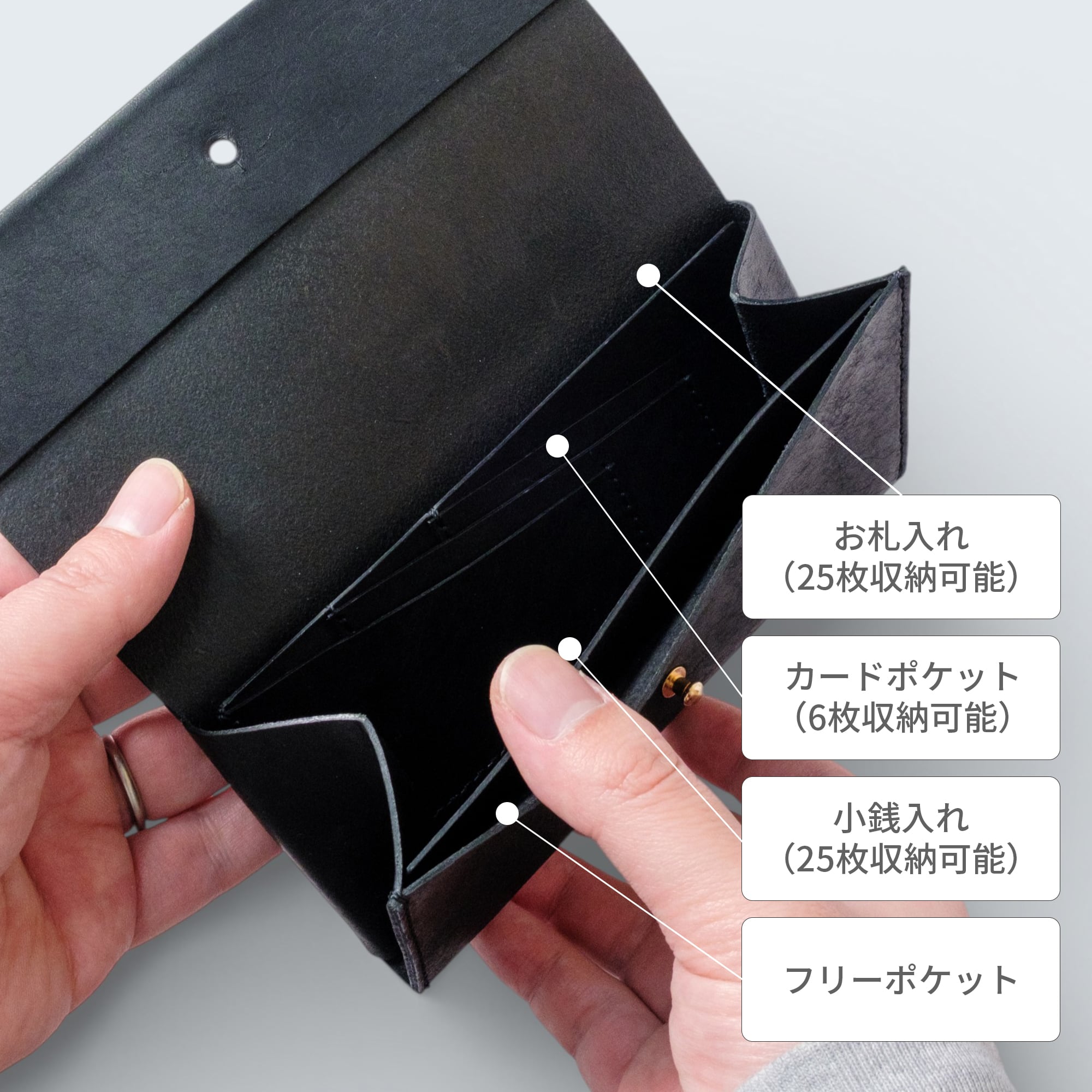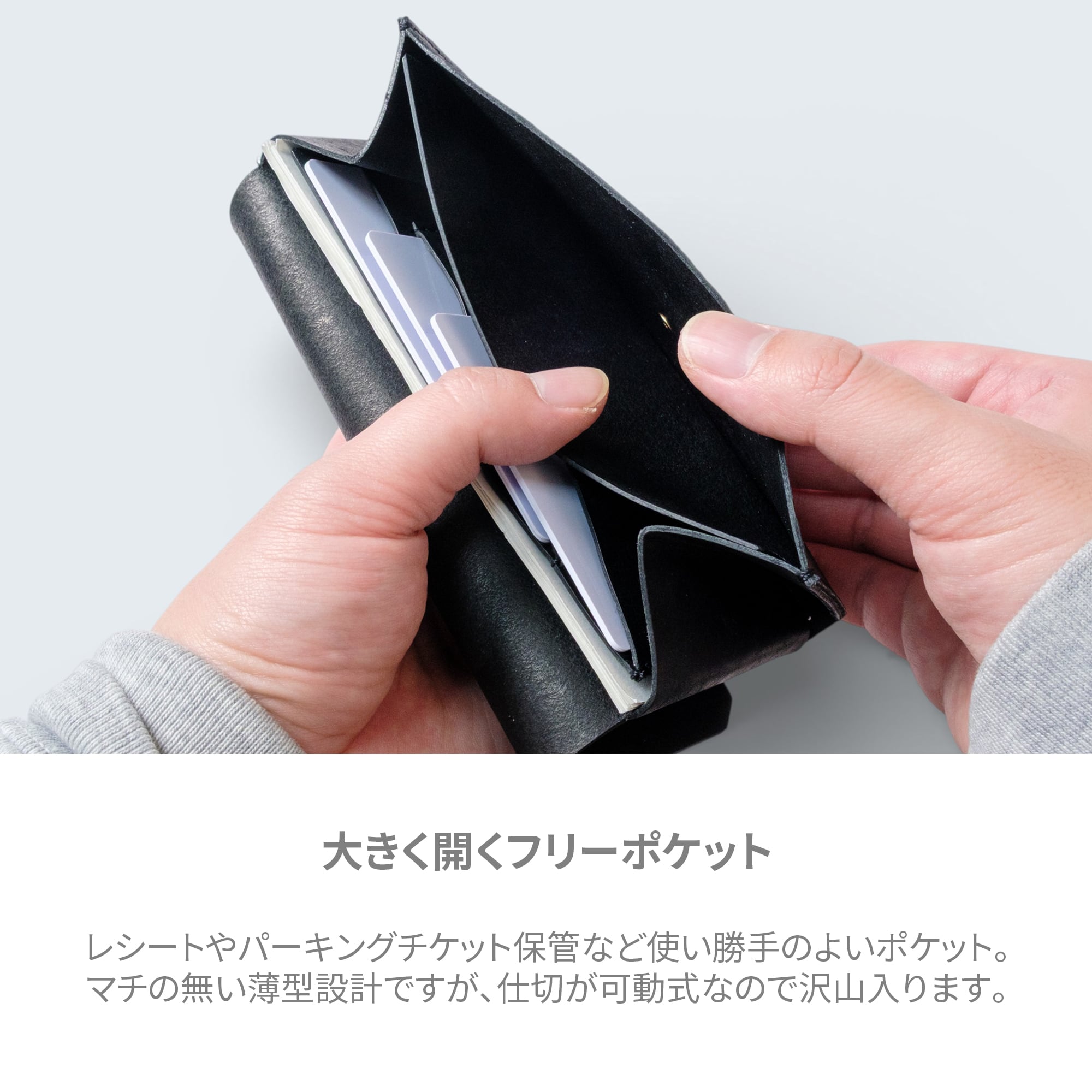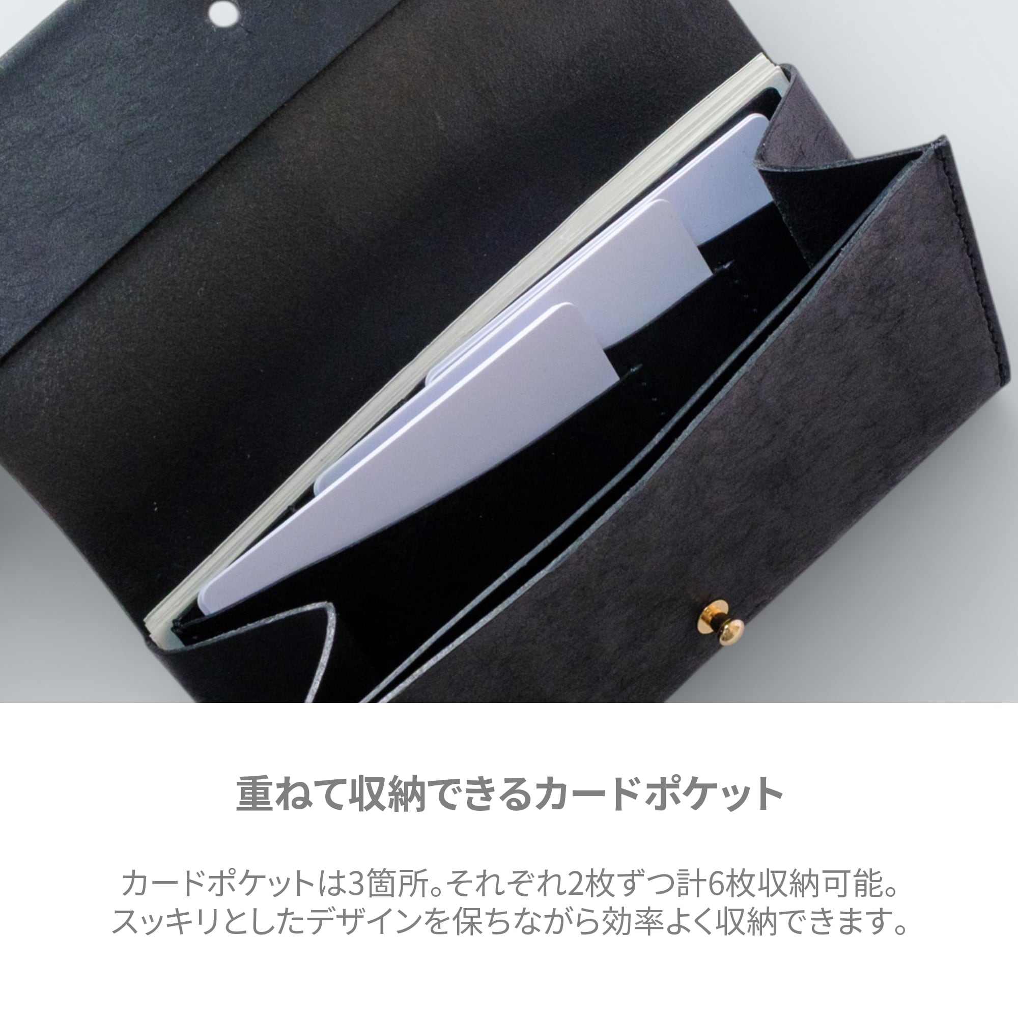 カードポケットを重ねることで、横に広げる必要がなく、紙幣サイズに収めることが可能に。見た目もすっきりとしたデザインを保ちながら、必要なカードを効率よく収納できます。