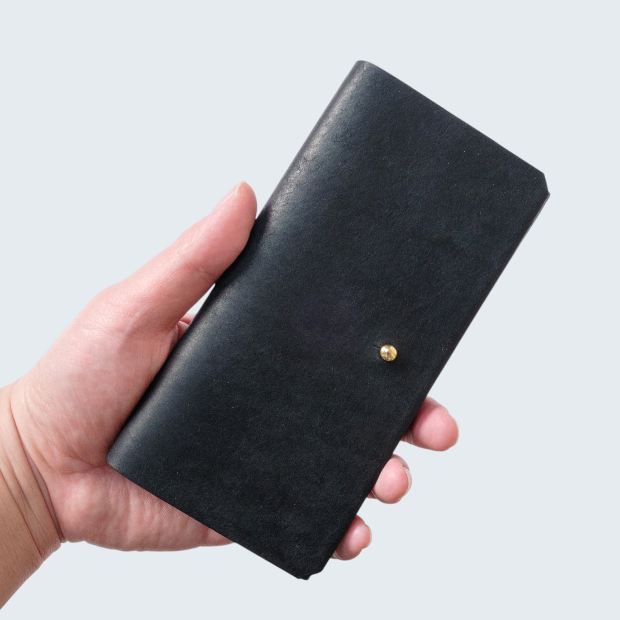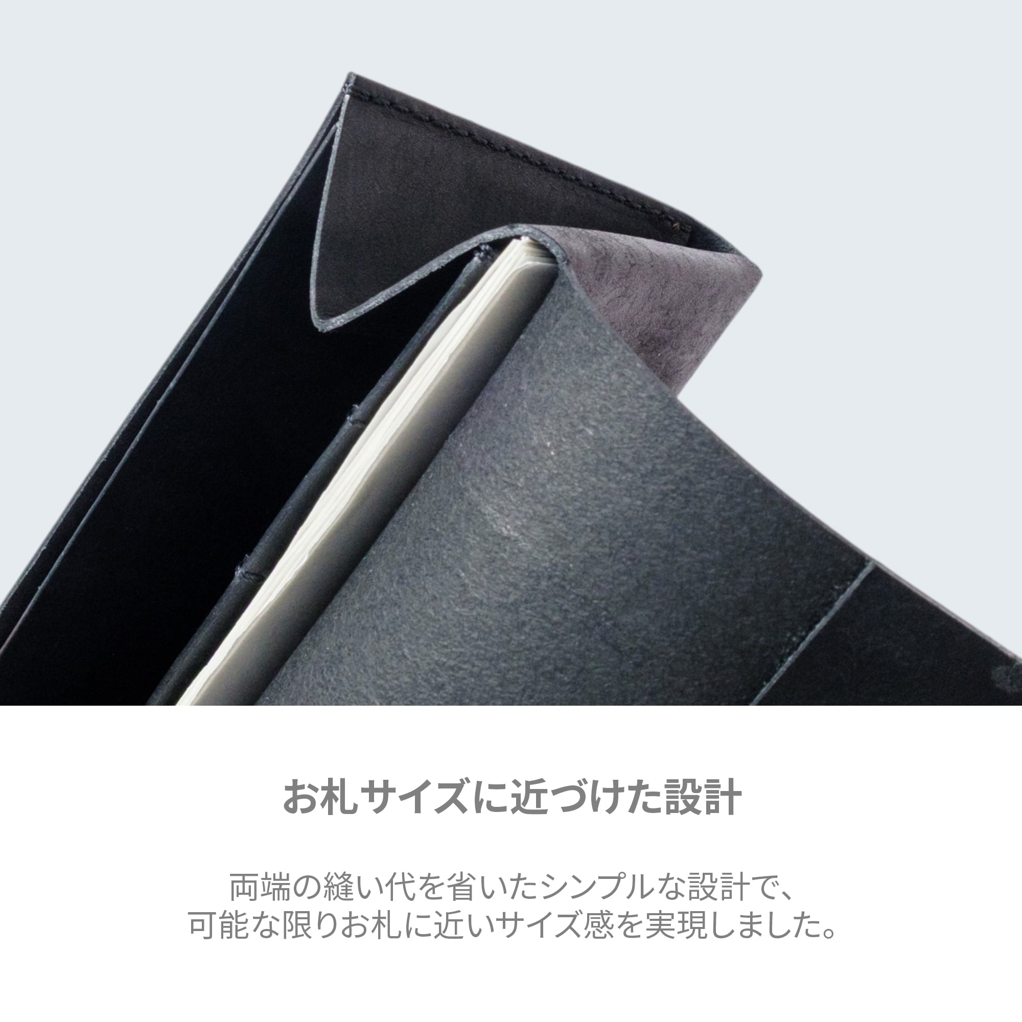 縫い代を省いたシンプルな設計で、可能な限り紙幣に近いサイズ感を実現しました。バッグの中でもかさばらず、ミニバッグやポケットにもぴったり収まります。