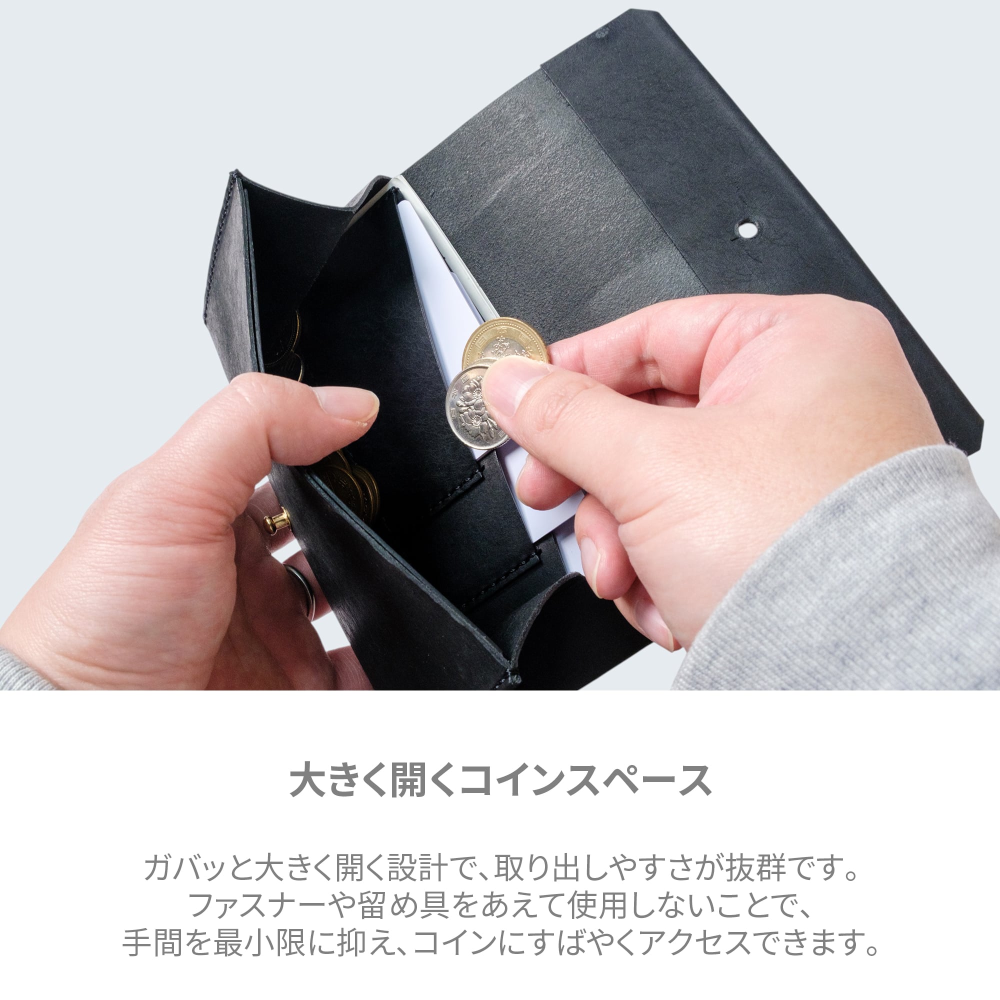 ガバッと大きく開く設計で、小銭を一目で確認でき、取り出しやすさが抜群です。ファスナーや留め具をあえて使用しないことで、手間を最小限に抑え、小銭にすばやくアクセスできます。財布を閉じた状態では小銭が飛び出る心配もありません。