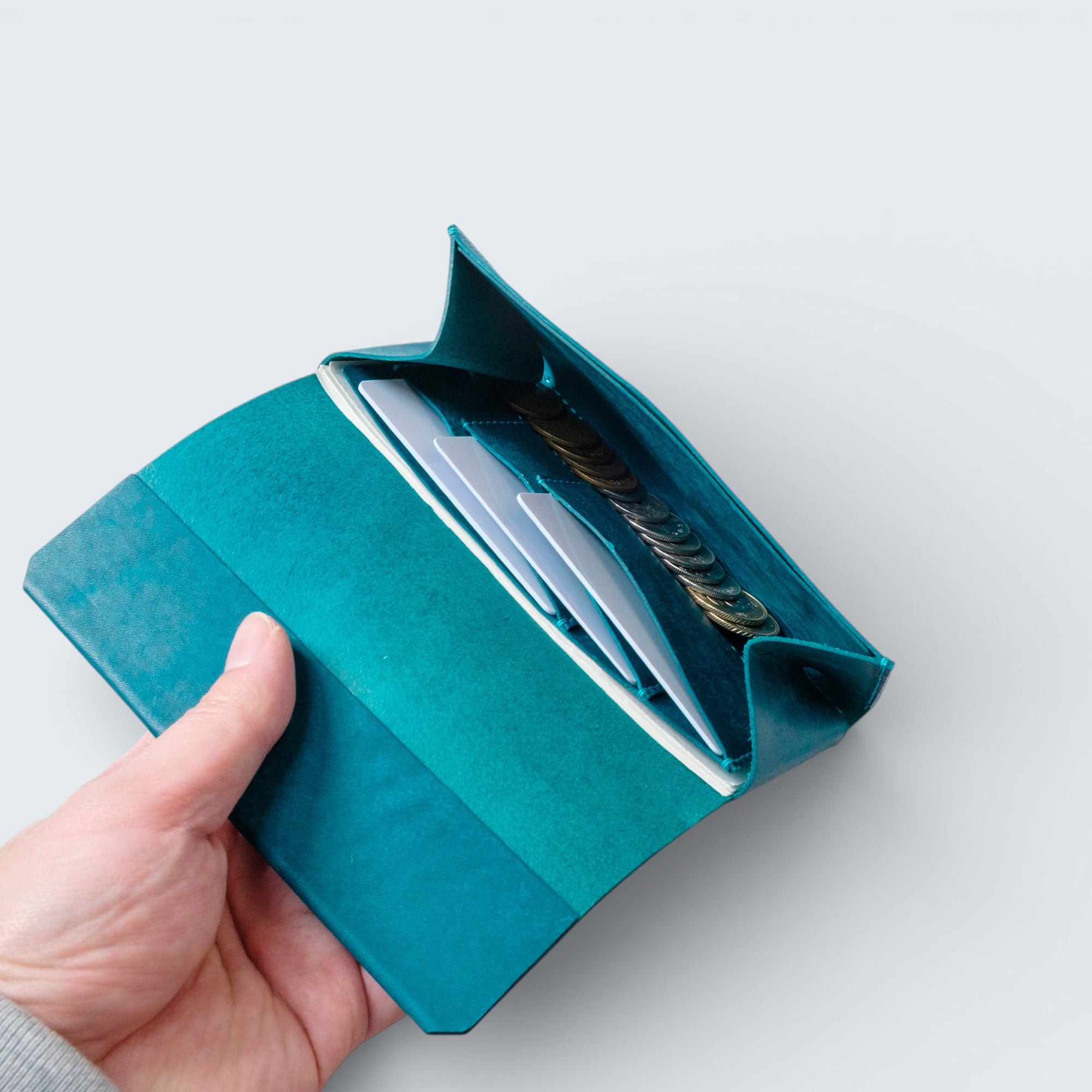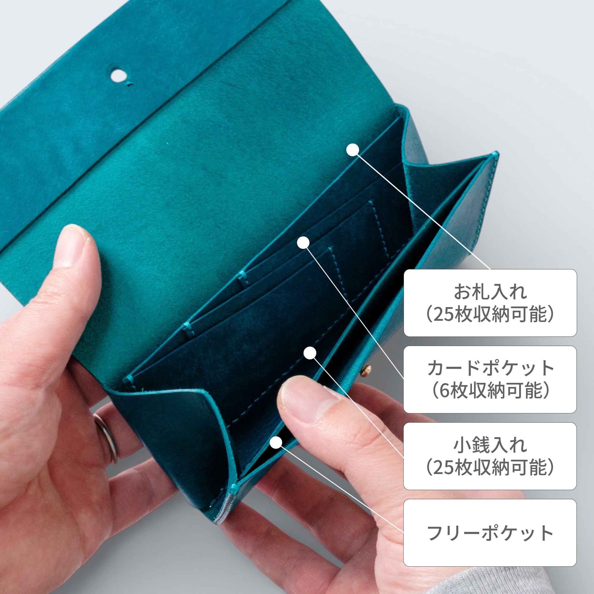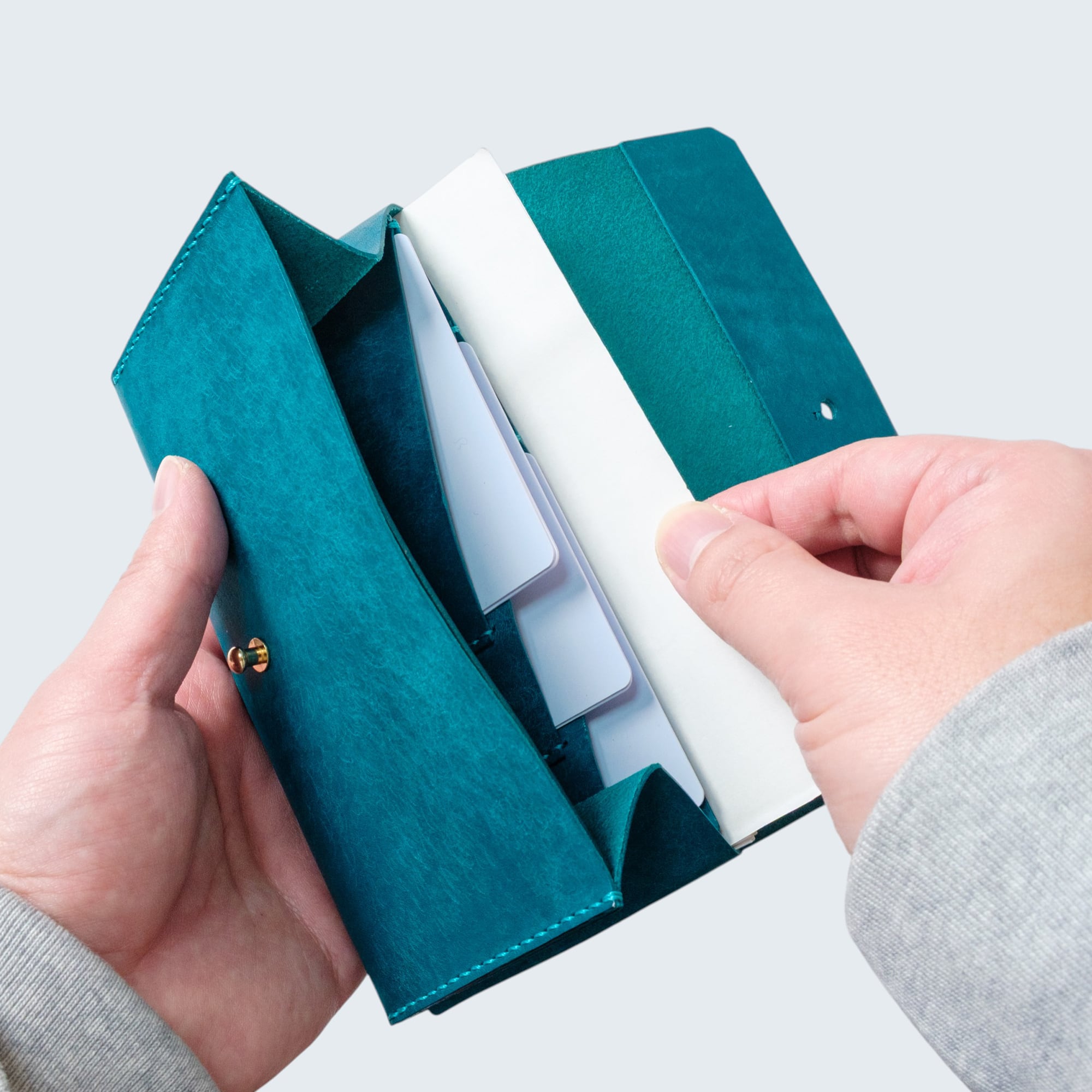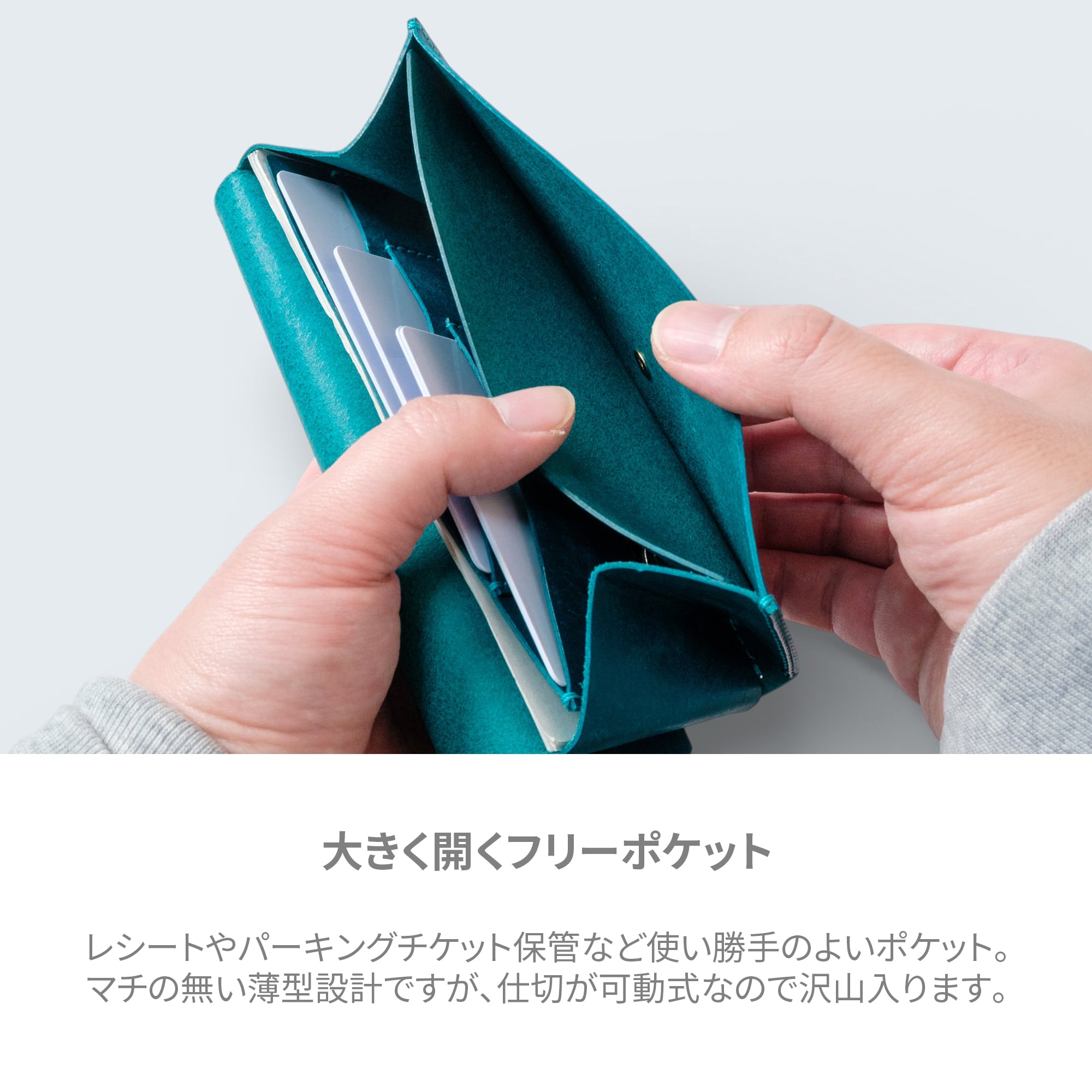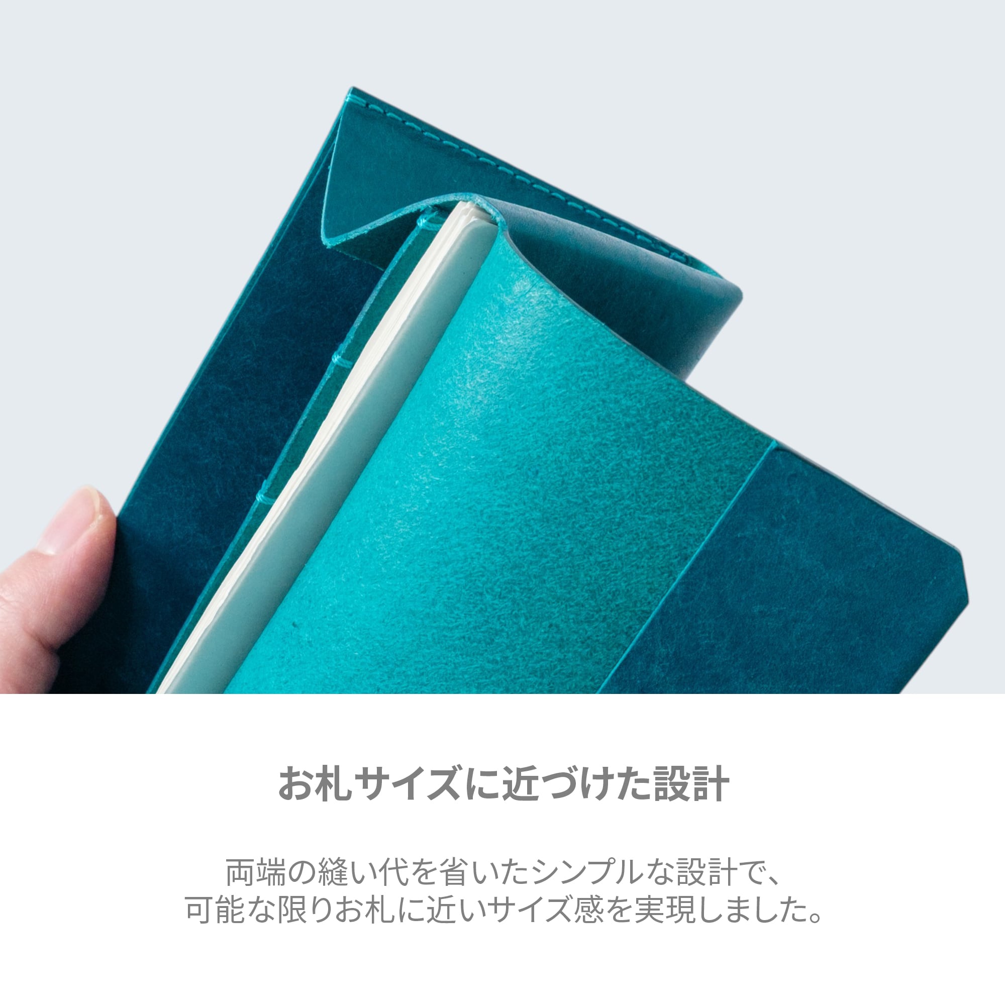 縫い代を省いたシンプルな設計で、可能な限り紙幣に近いサイズ感を実現しました。バッグの中でもかさばらず、ミニバッグやポケットにもぴったり収まります。