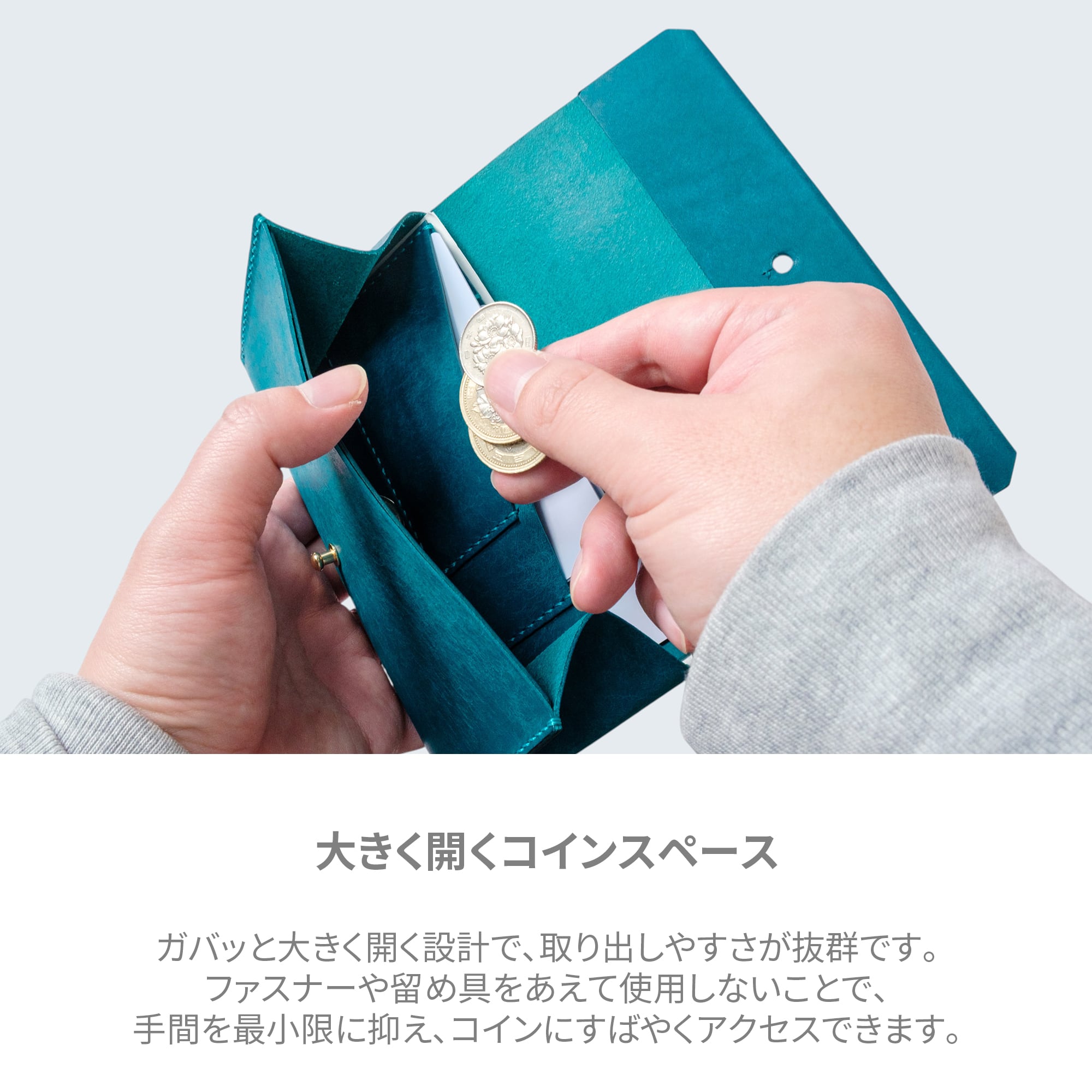 ガバッと大きく開く設計で、小銭を一目で確認でき、取り出しやすさが抜群です。ファスナーや留め具をあえて使用しないことで、手間を最小限に抑え、小銭にすばやくアクセスできます。財布を閉じた状態では小銭が飛び出る心配もありません。