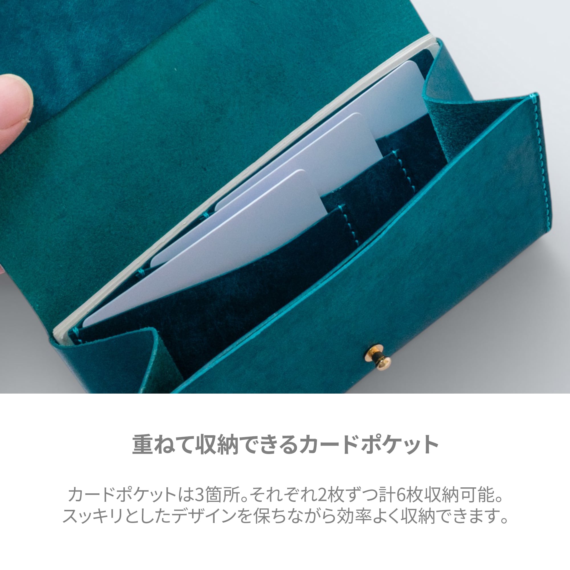 カードポケットを重ねることで、横に広げる必要がなく、紙幣サイズに収めることが可能に。見た目もすっきりとしたデザインを保ちながら、必要なカードを効率よく収納できます。