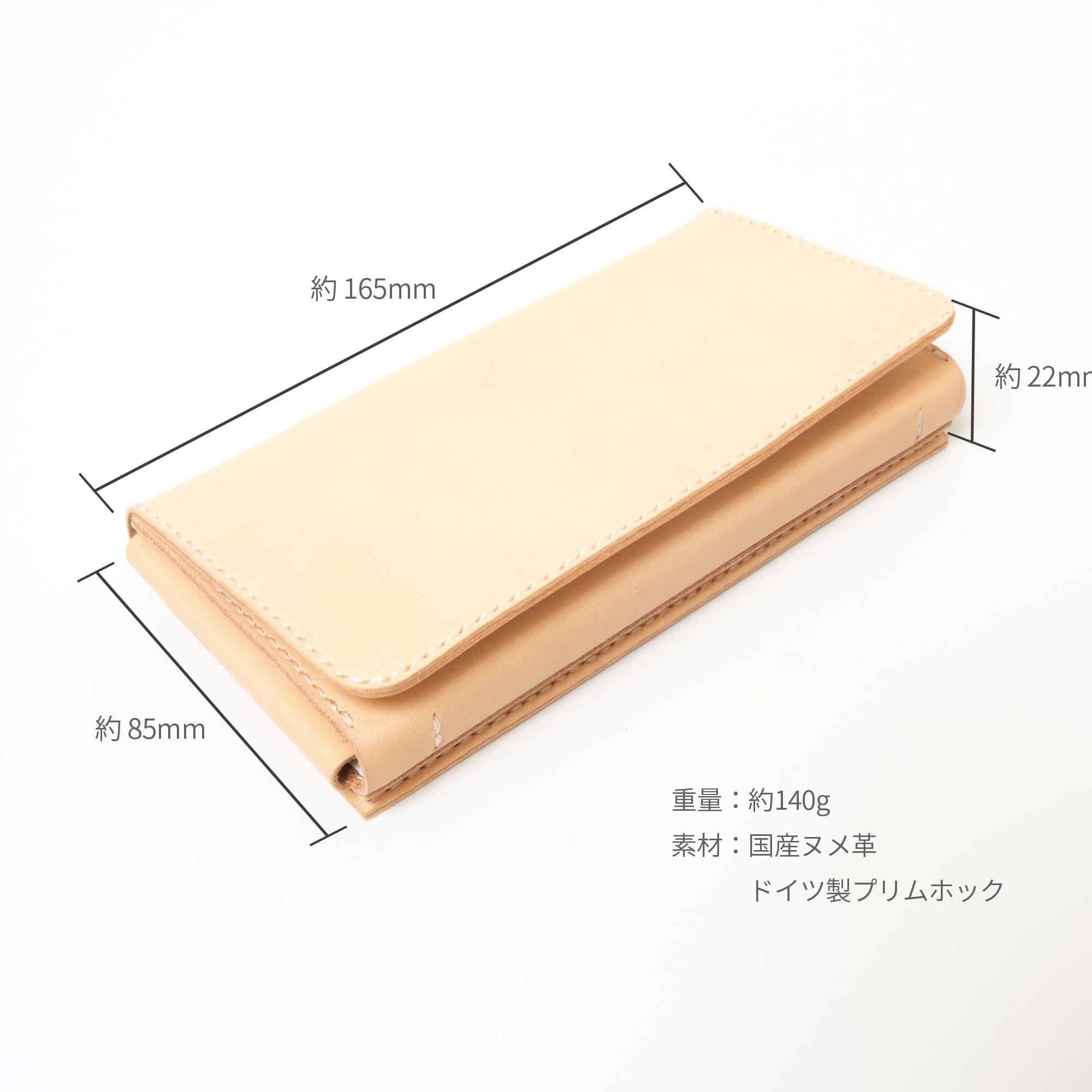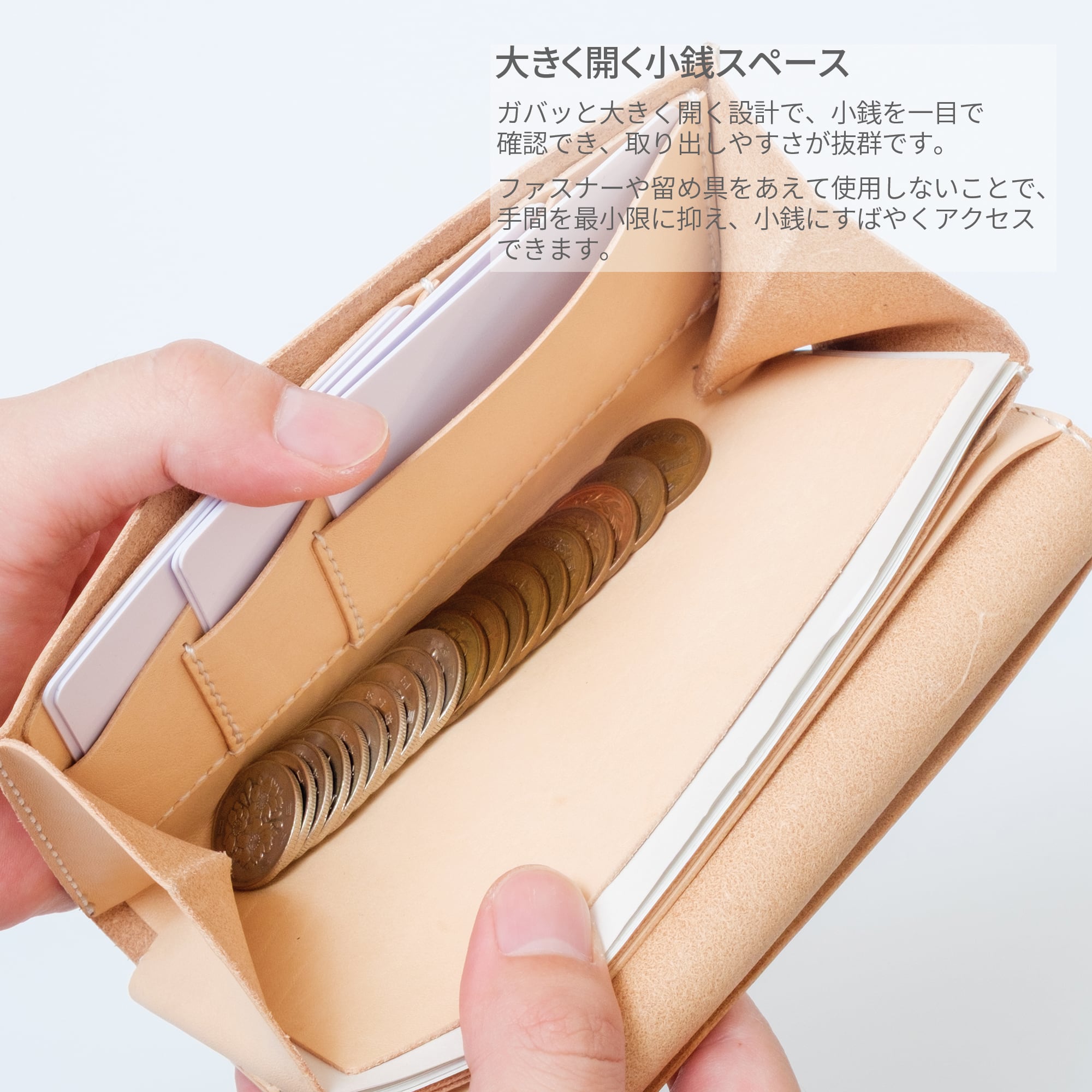 財布本体及びフラップカバーは国産のヌメ革を使用しています。淡いベージュ色のヌメ革は、使い込むほどに飴色や深みのある色合いへと変化。使い方や環境によって唯一無二の表情が生まれ、持つ人それぞれの個性を映し出します。