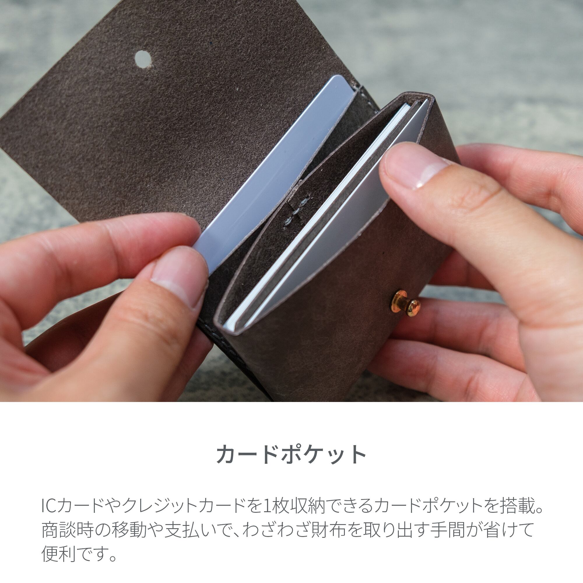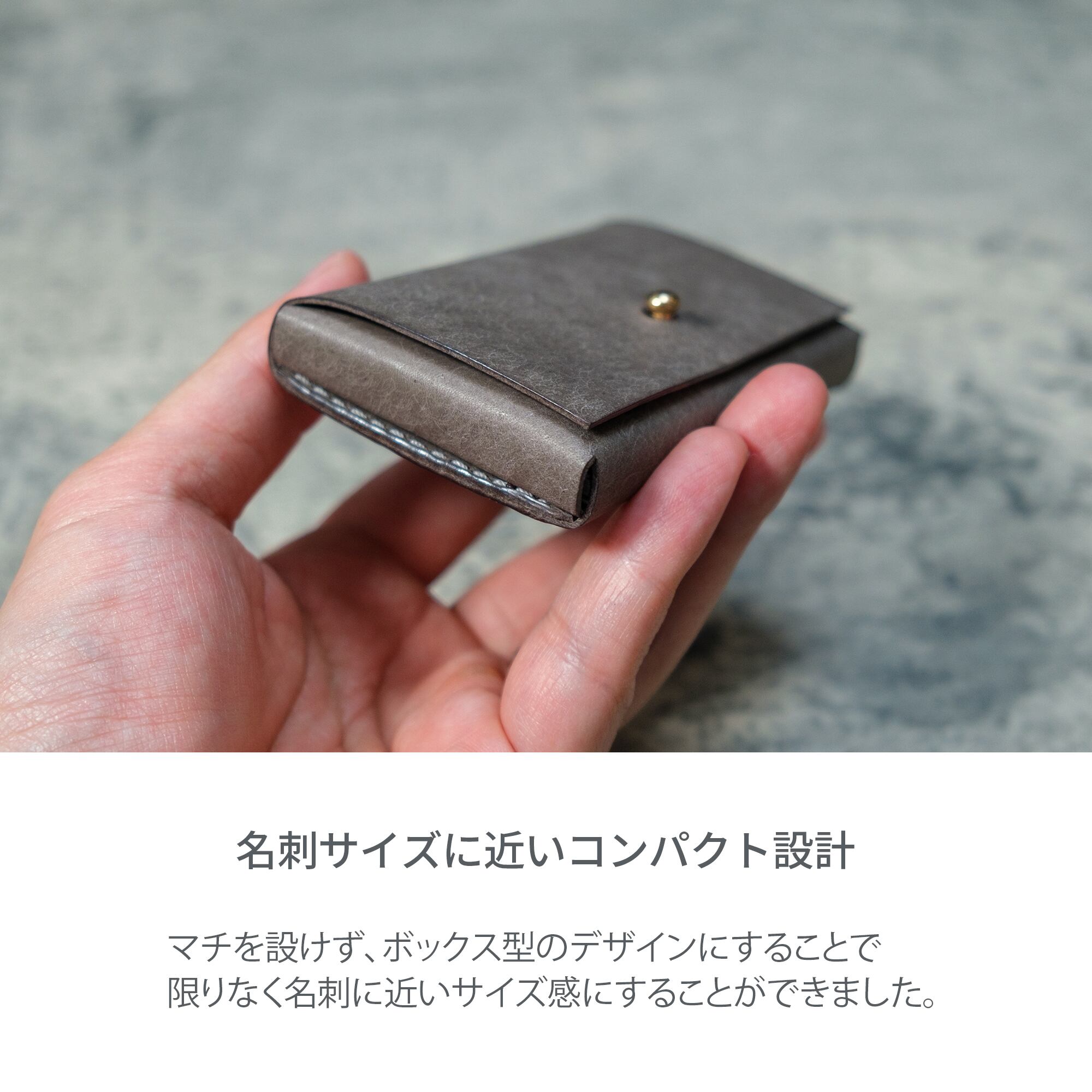 マチを設けずボックス型にすることで、ほぼ名刺サイズのコンパクトな設計を実現。名刺は一般的な「東京4号」に合わせて設計しており、搭載カードポケットにはICカードやクレジットカードを1枚促入可能。