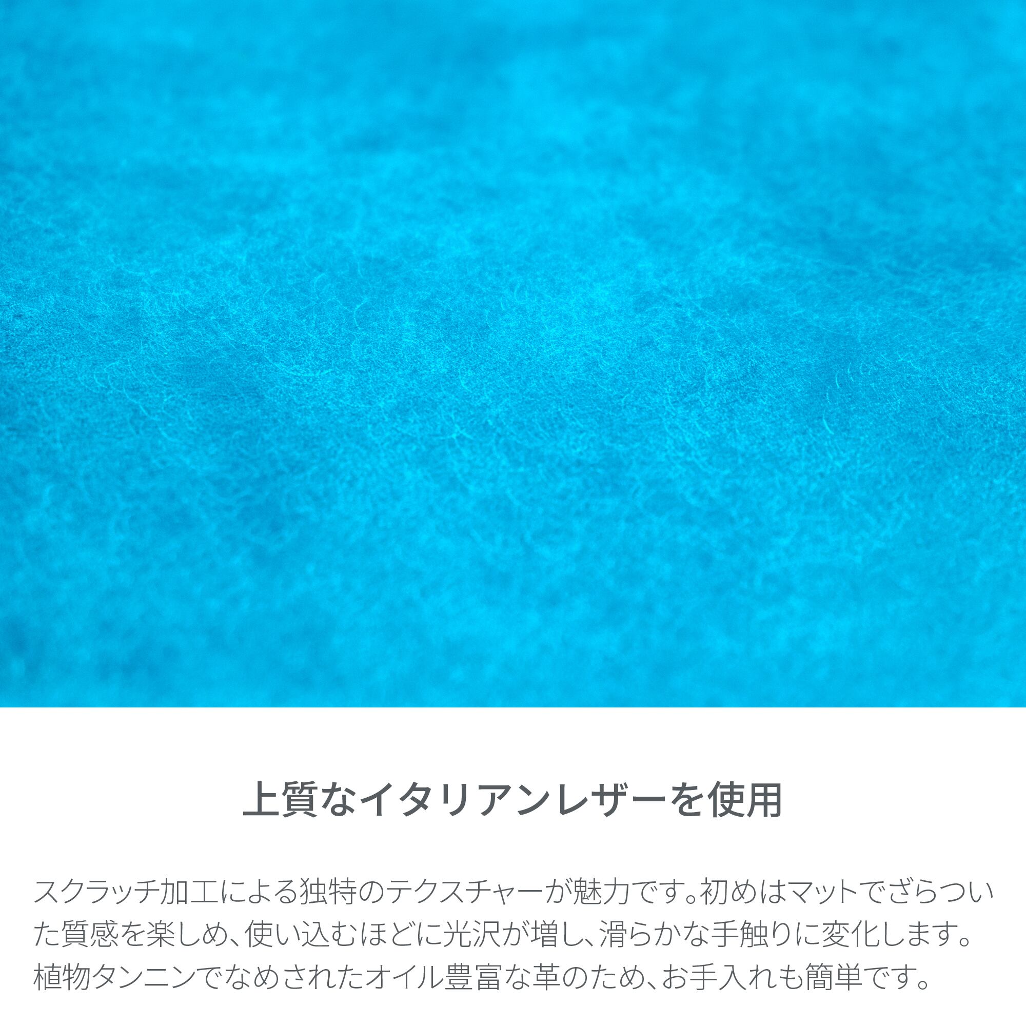 イタリアンレザーの「MARGOT / マルゴー」を使用。スクラッチ加工による独特のテクスチャーが魅力です。初めはマットでざらついた質感を楽しめ、使い込むほどに光沢が増し、滑らかな手触りに変化します。植物タンニンでなめされたオイル豊富な革のため、お手入れも簡単です。